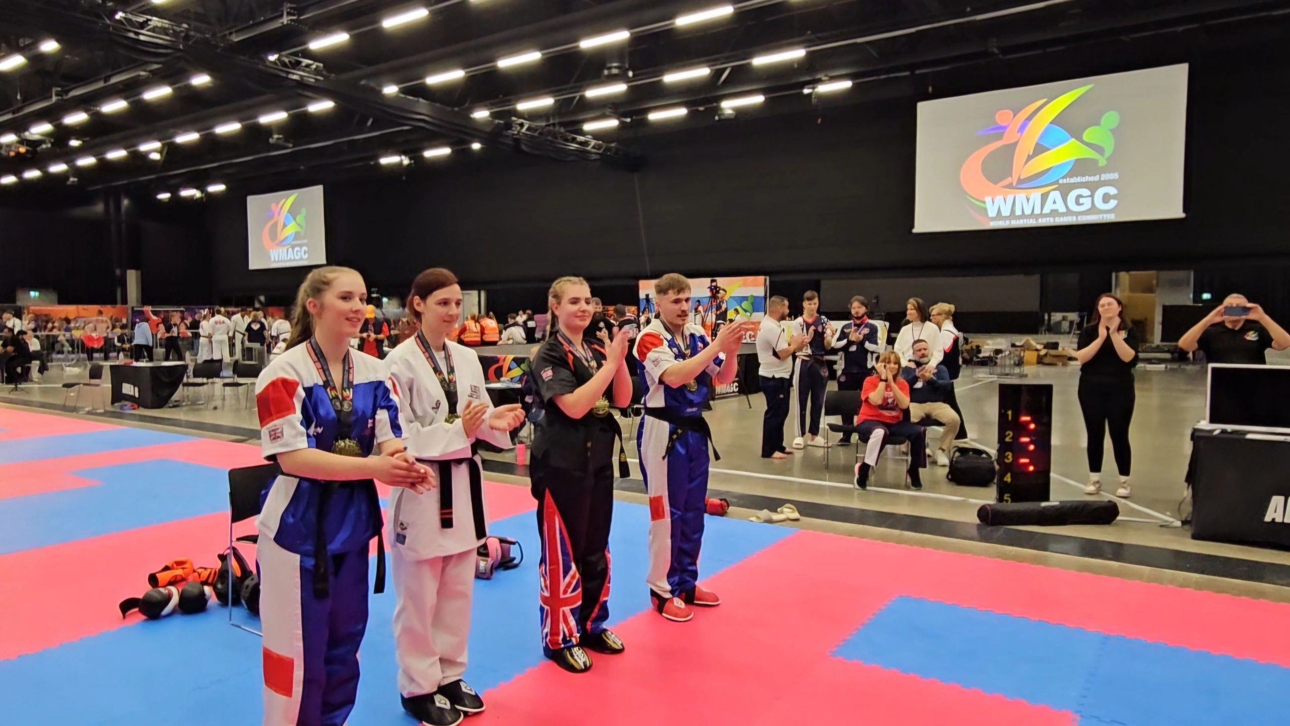 GB Martial Arts Team athletes from left to right Isabel Swanborough, Harry Smith, Mylee Hedges and Evie Swan, stand together for a picture after more success at the 2023 World Games.